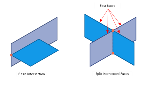 Faces may also be split if they share exactly two intersection points and have coincident split lines.