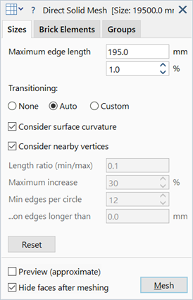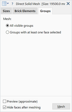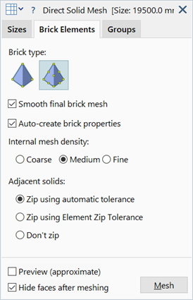 This function consolidates the two-step process of Mesh Tools: Surface Automesh followed by Mesh Tools: Solid Automesh from Plates to generate brick elements directly from geometry faces. This approach can speed up the process of solid meshing, and it can also avoid problems that may occur with the two-step process when plate elements are inadvertently detached or zipped (particularly plate elements representing adjoining faces of separate solids).