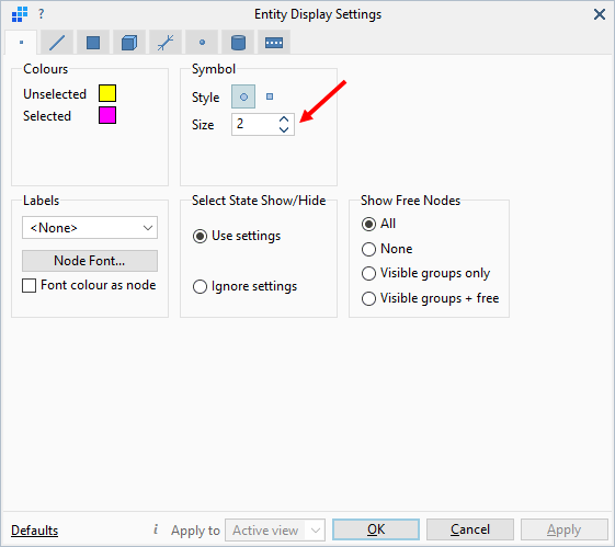 Strand7 also allows you to size some objects in pixel space. Examples of this include element outline thickness, node size, restraint attribute length and thickness, and many others. To mix model space and pixel space objects in the model window, Strand7 has to calculate a scaling factor between the size of a pixel and a unit of physical length for the model in the current view. With this, a 3-pixel (say) node will be rendered as three pixels on screen, no matter the physical dimensions of the model. Maintaining a precise scaling factor is not straightforward, especially when perspective is used and when the model is continually changing in size or zoom. In most cases, Strand7 is able to update the factor to keep pixel sizes approximately constant as the model size or the view changes. However, there are some operations that cannot update the scaling factor, so it is possible that pixel-based features on the model appear out of sync at some point. This often manifests by nodes and other features appearing smaller than expected in the model window.