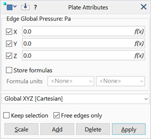 Assigns uniform global pressure to selected edges of plate elements using three orthogonal components and a coordinate system.
