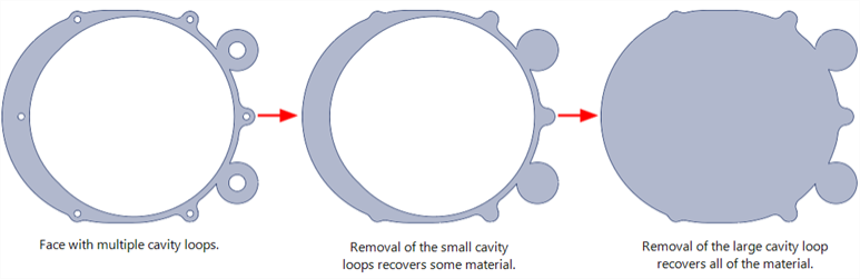 Although this function deletes all cavity loops on a face, it is also possible to selectively delete cavity loops as illustrated in the following image.