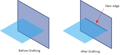 Creates new edges on selected faces that coincide with edges belonging to other selected faces. Each edge must lie on the target face within the specified distance. A face that is only partially selected (e.g., when its outer loops are not selected but one or more of its cavity loops or edges are selected), is excluded from receiving any grafts, but its selected edges may be grafted onto other selected faces.