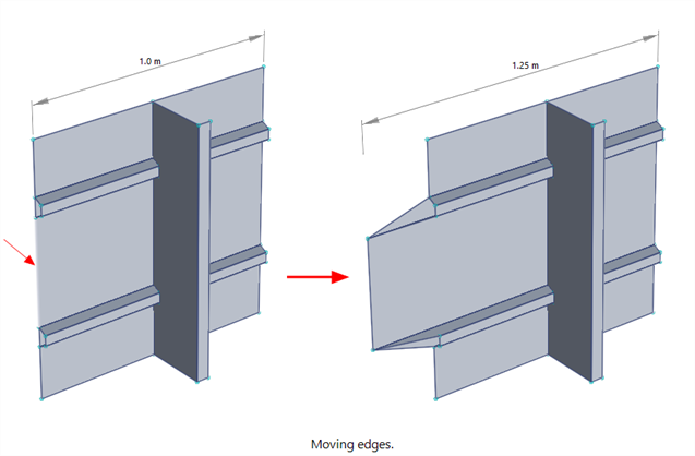 In the image below, four vertices are selected and moved. All faces that reference those vertices are affected by the vertex move operation.