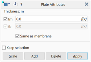 The membrane and bending thicknesses can be different for linear isotropic, orthotropic and anisotropic plates. The membrane thickness is used to assemble the membrane stiffness matrix, whereas the bending thickness is used to assemble the bending stiffness matrix (see Properties: Plates).