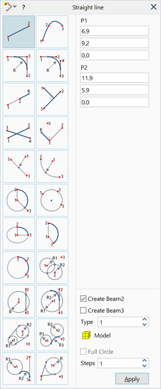 Beams are typically created between geometric points (e.g., circle centres and intersections) and along curves (e.g., lines and arcs).