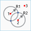 Creates a circular arc or full circle of radius R3 tangent to two circles centred at points P1 and P2, with radii R1 and R2, respectively.
