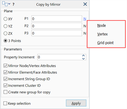Many of the tools require the selection of points for the definition of a feature like a line, a plane, or just a point. A point can be a node, a vertex or a grid point. The point numbers can be entered manually as integers in the edit boxes, or retrieved from the model window by clicking points. When entering integers manually, the type of point (i.e., node, vertex or grid point) can be specified by clicking the label to the right of the edit box and selecting from the popup menu.